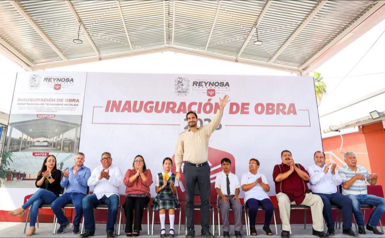 Por Nadia Tapia.- Inaugurando la Techumbre Metálica en la escuela primaria Aquiles Serdán, de la colonia Rancho Grande, el Presidente Municipal Carlos Peña Ortiz, fue recibido por la Directora Wendy Roxana Castro Lores y los alumnos Briana Camila González Cruz y David Alarcón Rincón.