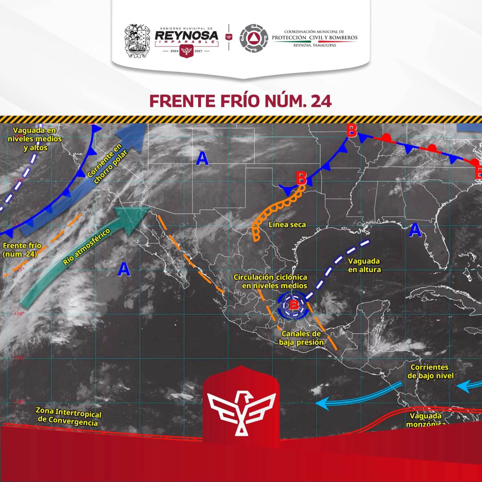Por Nadia Tapia.- La Coordinación de Protección Civil y Bomberos del Gobierno de Reynosa le da a conocer que, el Frente Frío Número 24, que arribó a esta frontera el día sábado 27 de diciembre, provocará un descenso en la temperatura hoy domingo 28, 11° Centígrados y más de 20% de probabilidad de lluvia.